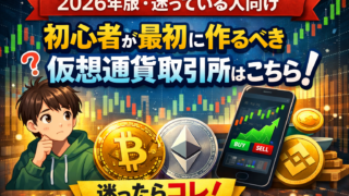 仮想通貨 初心者が最初に作るべき仮想通貨取引所はこちら【2026年版・迷っている人向け】 先に結論だけ言うと、仮想通貨の初心者は 「国内の大手取引所を1つだけ選んで、少額から始める」 これで十分です。 「仮想通貨を始めたいけど、どの取引所を選べばいいか分からない…」「調べるほど種類が出てきて、逆に動け... 2026.01.27 仮想通貨